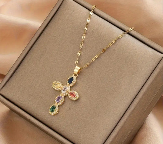 Cadena de cruz con circones de colores/ Cross chain with colored zircons.